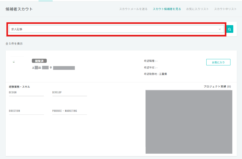 自社の求人記事を「気になるリスト」にしたユーザーを、スカウト候補者として管理画面上で求人毎に表示します。求人に関心を示しているため、高いスカウト返信率が期待できます。