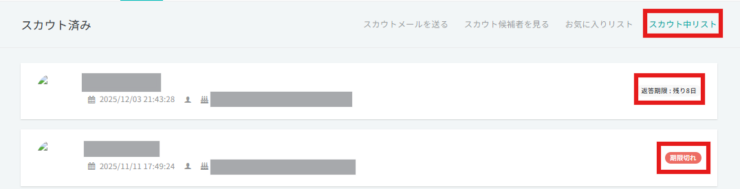 スカウトを送信した候補者は「スカウト中リスト」からご確認いただけます。