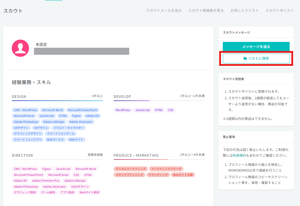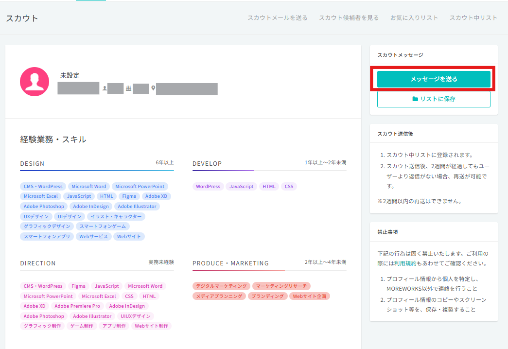 プロフィール情報から個人を特定し、MOREWORKS以外で連絡を行うこと