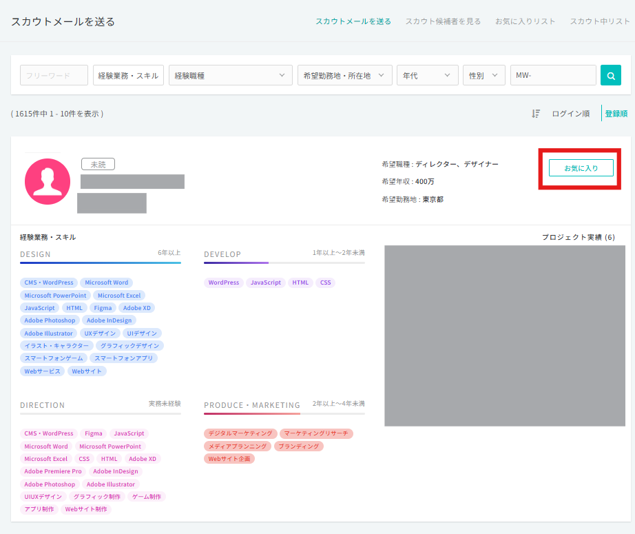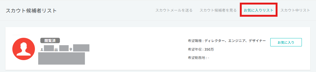 ▼お気に入りした候補者はスカウト≻お気に入りリストからご確認いただけます。