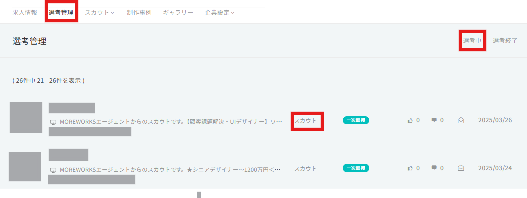 スカウトが受諾されたら「選考管理」画面に追加されます。