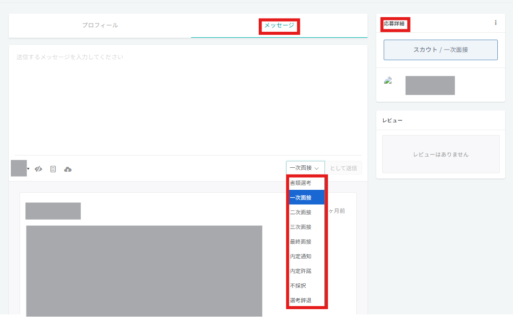 候補者を選択いただくと、メッセージ送信やステータス変更ができます。ステータス変更は選考状況に応じてご登録ください。