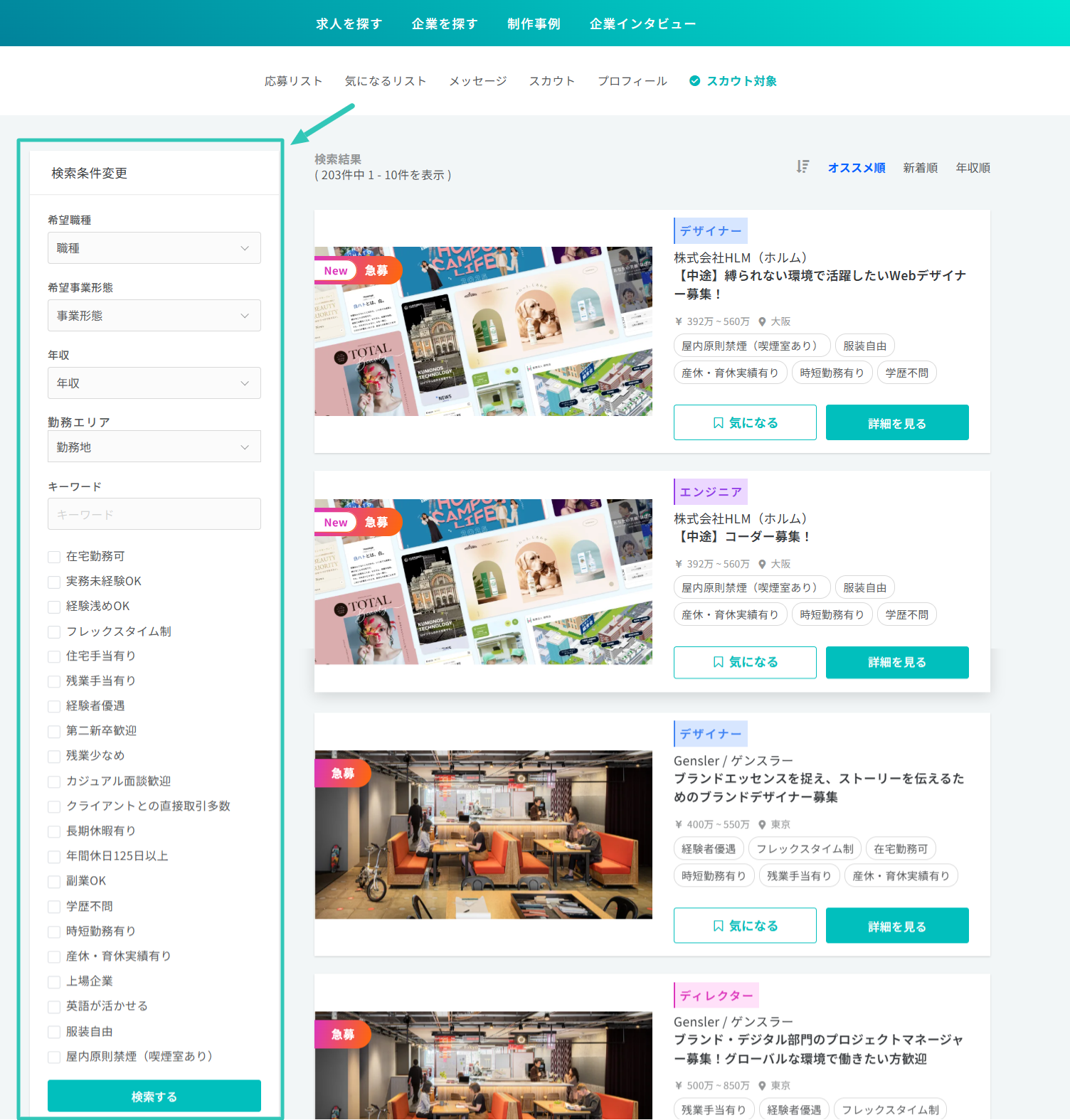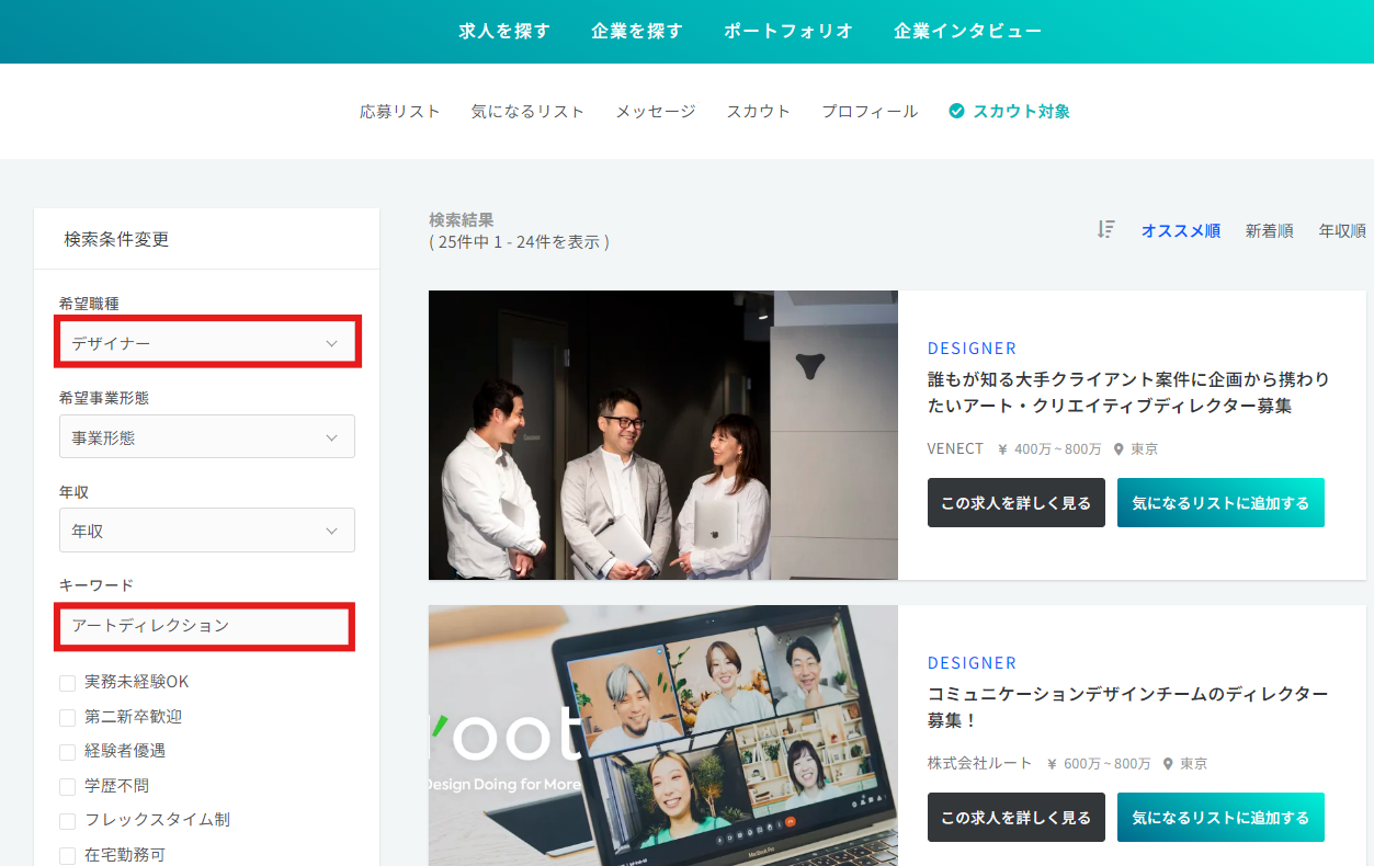 自動的に希望職種に「デザイナー」、キーワードに「アートディレクター」に入力され、合致した求人が表示されます。
