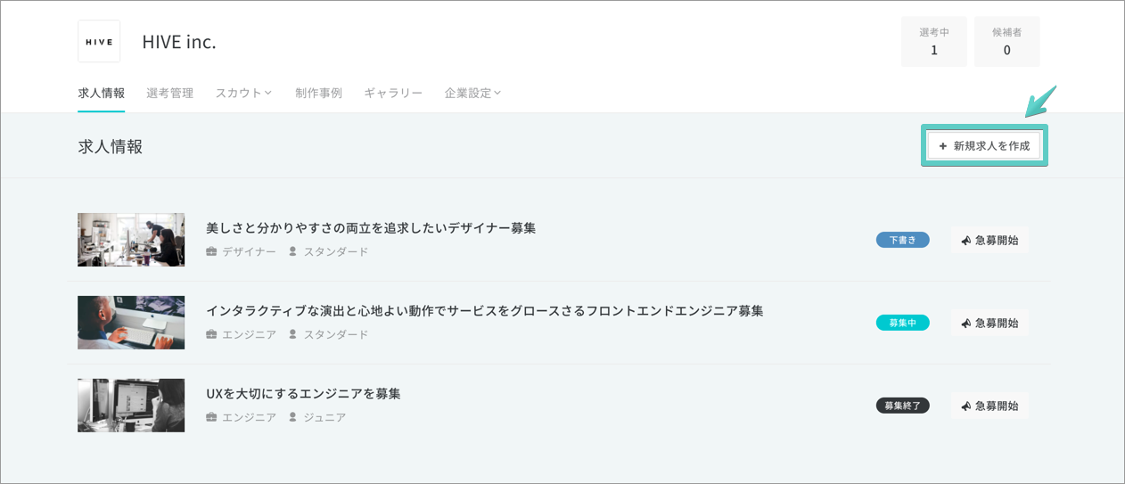 新規求人記事は 求人情報 > 新規求人を作成 にて追加できます。